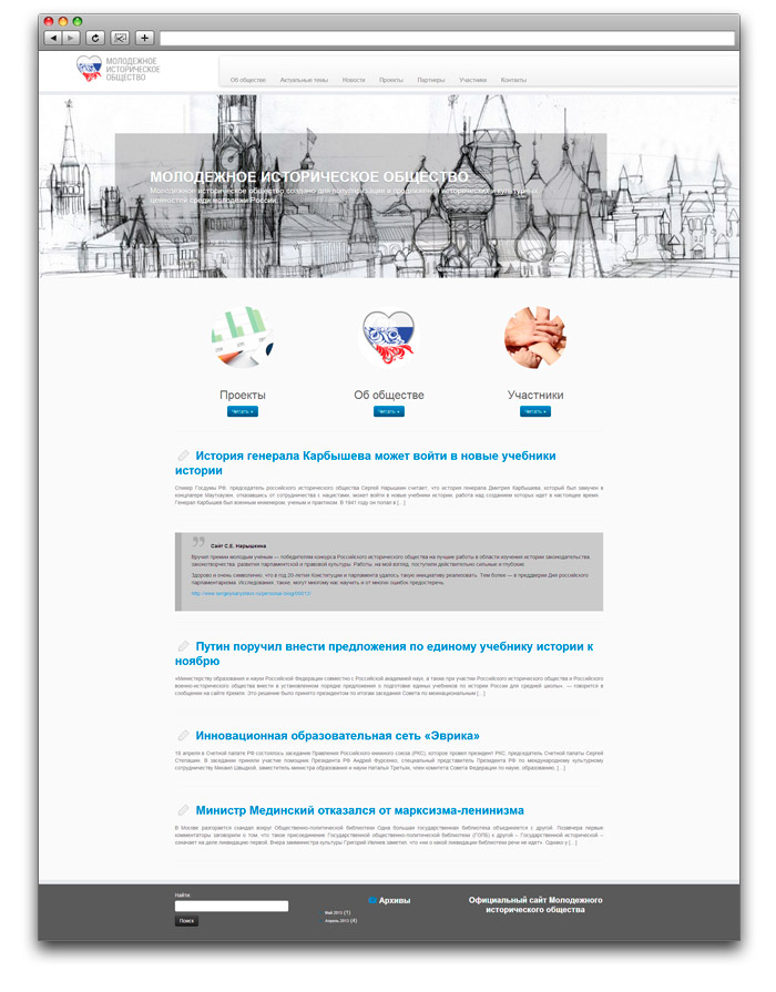 Новый проект объединяющий молодых людей занимающихся историей России запускался в короткие сроки. В результате был придуман простой логотип объединяющий любовь к России и ее историческим корням.