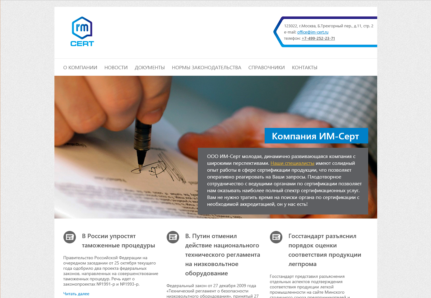 «ИМ-Серт» - молодая, динамично развивающаяся компания, специалисты которой имеют солидный опыт работы в сфере сертификации, что позволяет оперативно реагировать клиентские запросы.