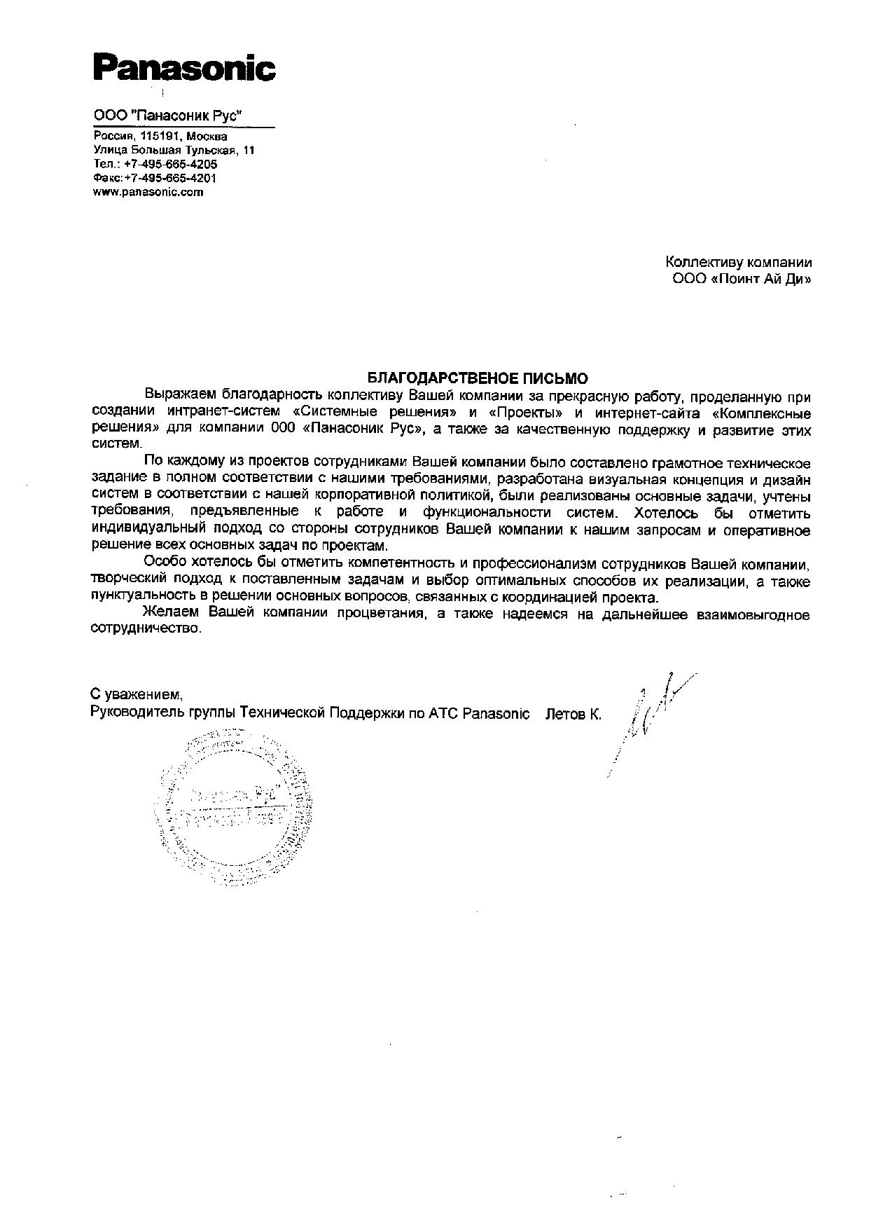 Поддерживается и развивается интранет-портал службы технической поддержки системных решений Panasonic, в рамках которого разработаны единая информационная площадка для работы сети технических центров Panasonic в России и странах СНГ.