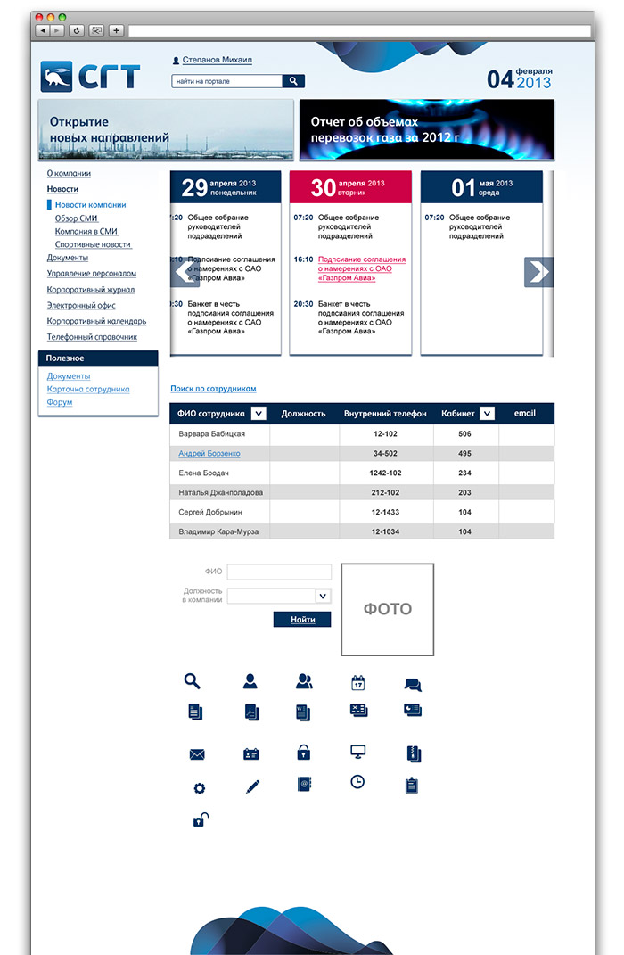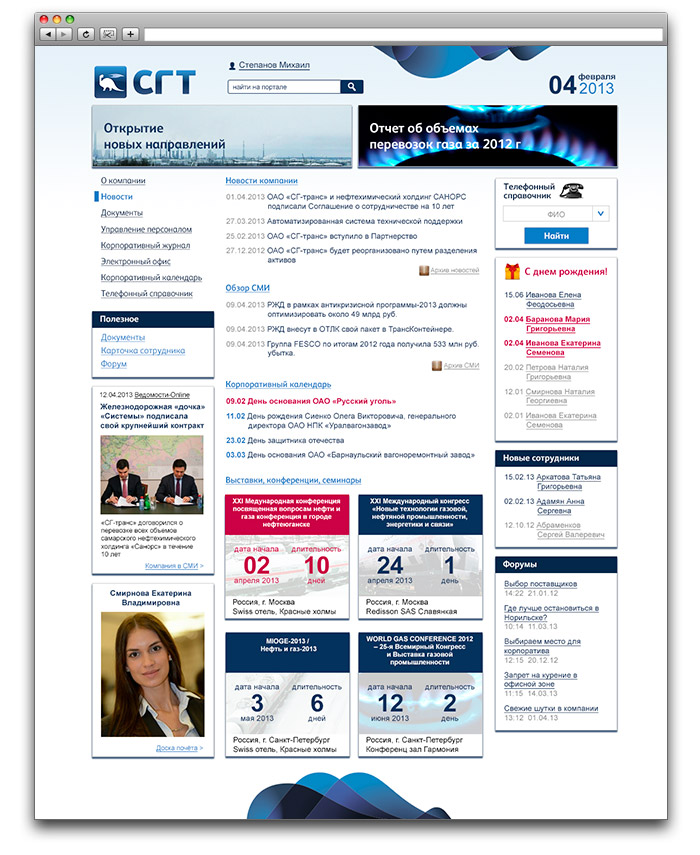 Главная страница отображает всю текущую активность на портале, новостную ленту, события, напоминания о днях рождения, свежие сводки из СМИ. Была разработана система публикации адресной информации и работы со сложными справочниками телефонных номеров, связка с днями рождения, календарем мероприятий во всех территориальных отделениях компании.