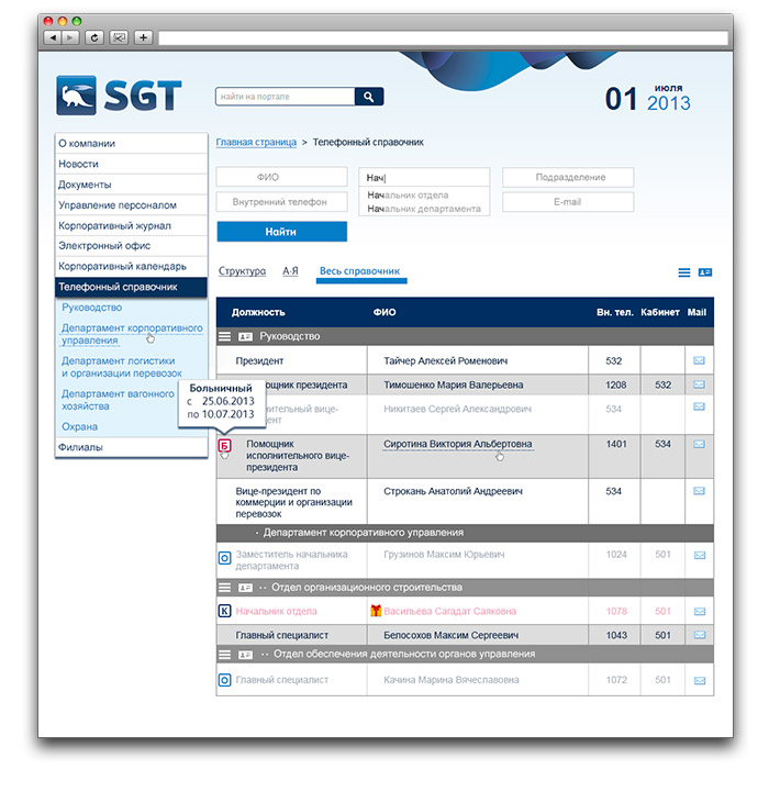 Наиболее часто используемой частью портала является «Телефонный справочник», благодаря интеграции с событиями и расширенной системой поиска, можно не только узнать адресную информацию о сотруднике, но и его текущий статус на основании данных отдела кадров, например — «Отпуск»